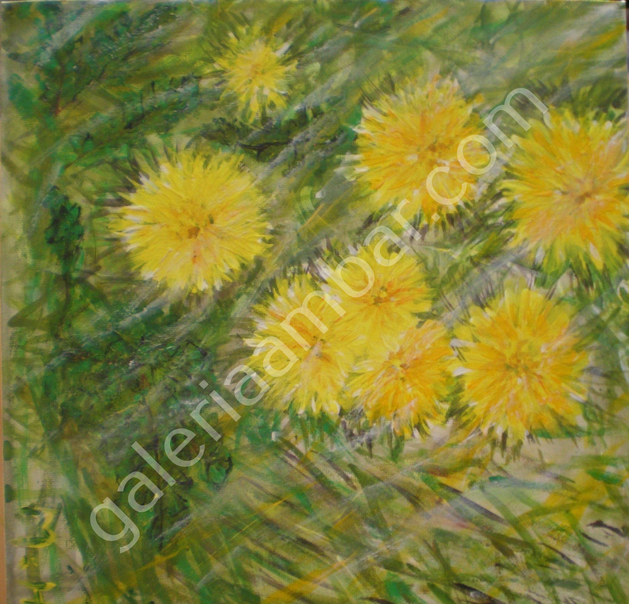 Flores de diente de león / Danedelion in bloom. 2025. Acrílico sobre lienzo. M. Toftegaard. Medidas: 12cm x 12 cm